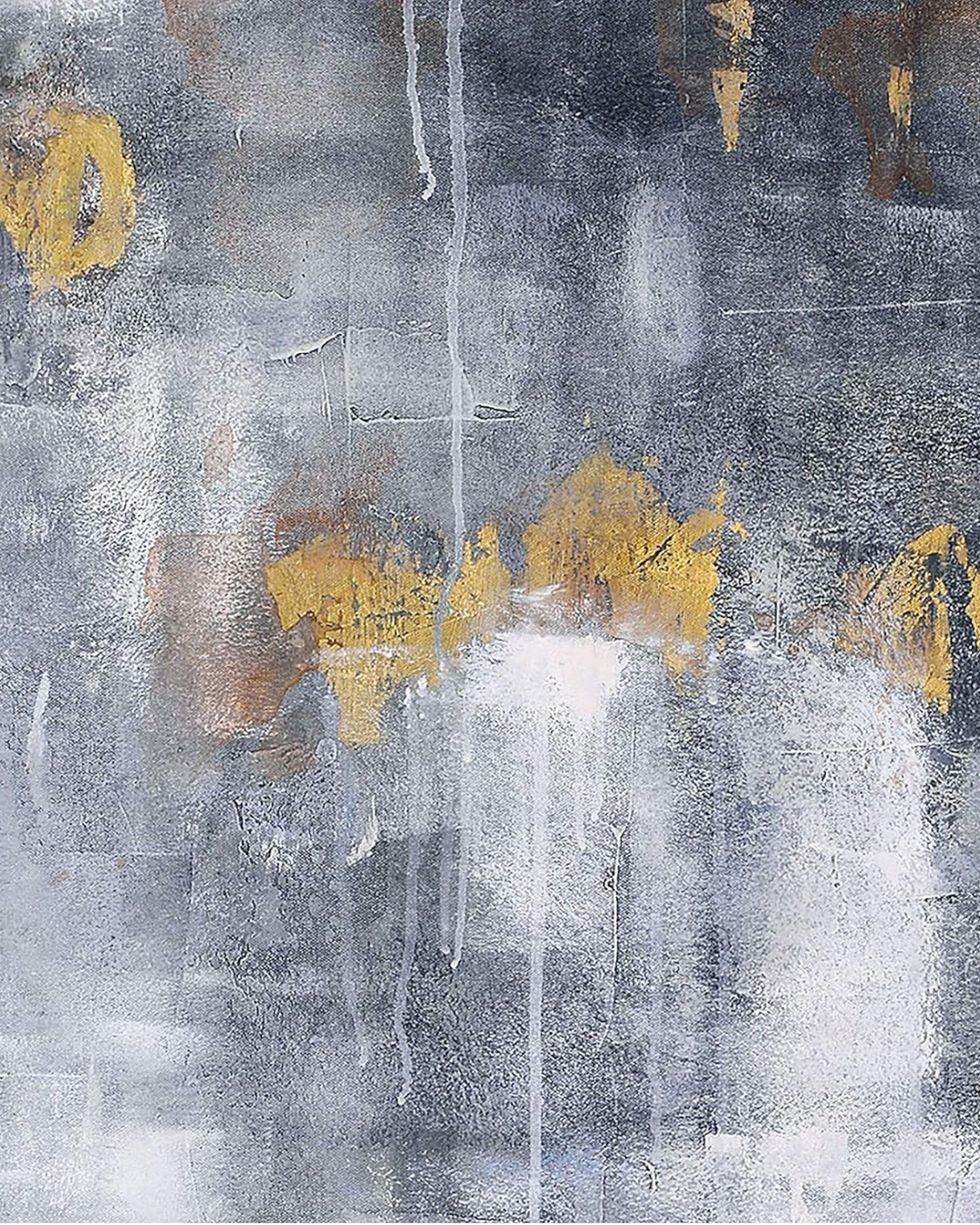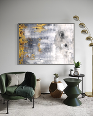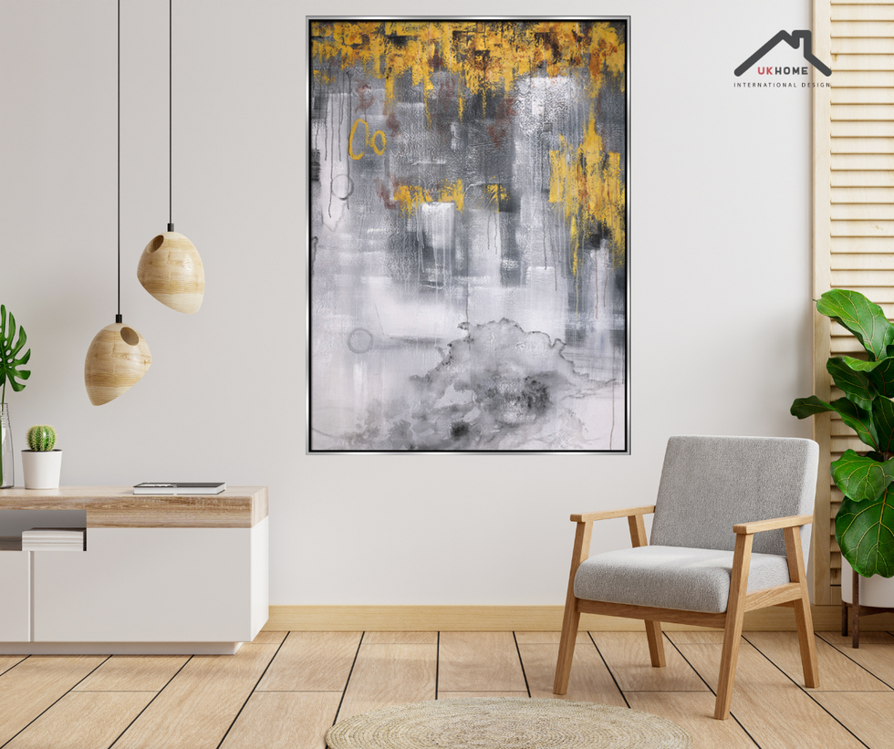 Sumérgete en la armonía de tonos grises y dorados con este cautivador cuadro de 120x160 cm, pintado a mano por artistas internacionales. Su atmósfera abstracta, llena de contrastes y texturas, evoca un estilo contemporáneo que aporta elegancia y sofisticación a cualquier espacio. El marco flotante plateado realza su presencia, convirtiéndolo en el punto focal perfecto para tu hogar u oficina.